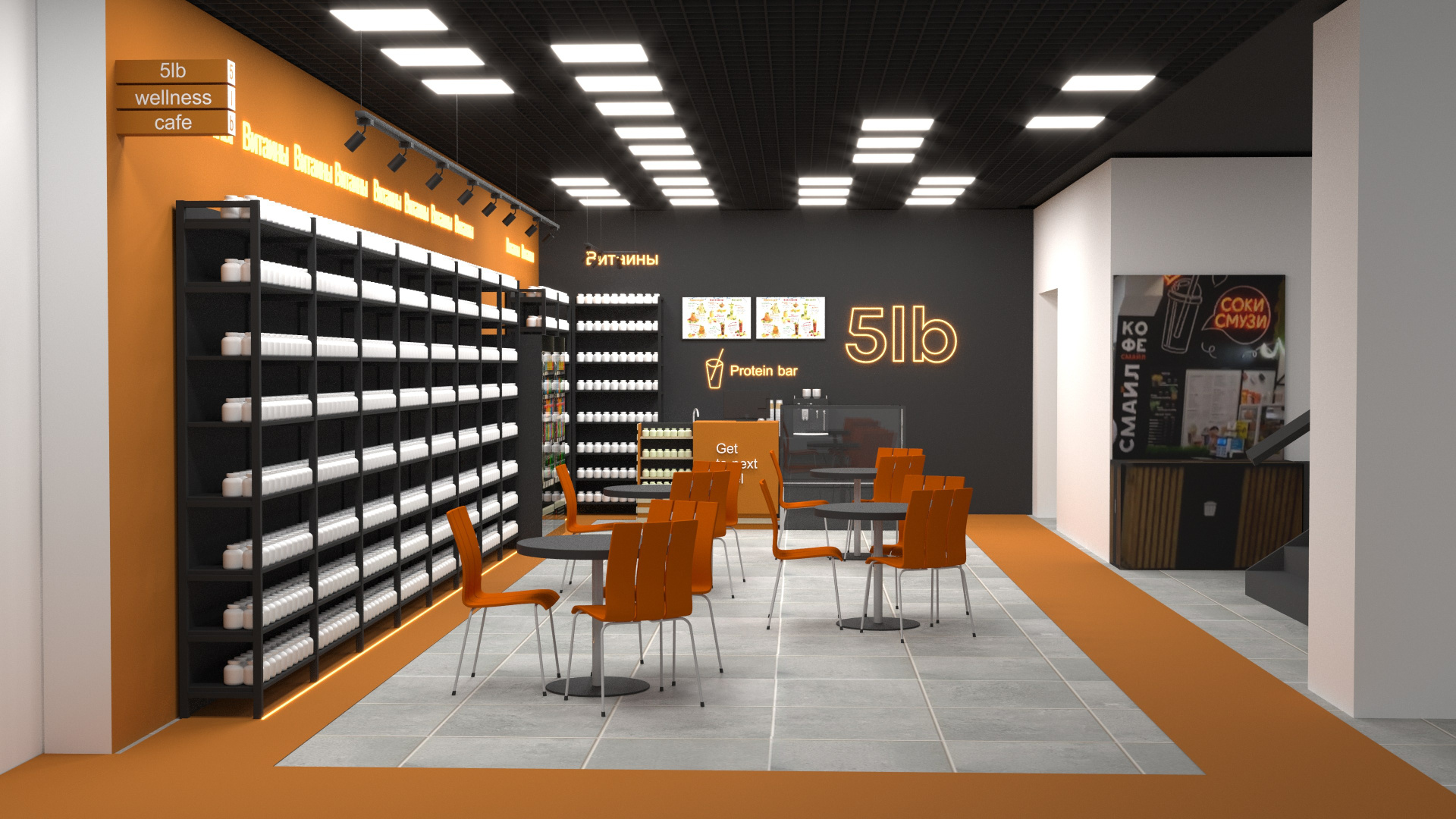 Визуализация магазина спортивного питания 5lb для согласования с торговым центром (в Перми). Большая зона стеллажей с продукцией, открытая зона мини кафе.
